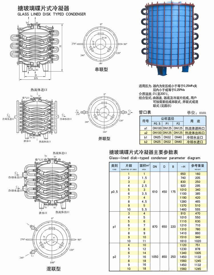 1、搪玻璃碟片式冷凝器分P1型及PO. 5型两种型号。伶凝面积P0.5型,每片为0.5平方米,91粉色视频外径为700mmo P1型,每片冷凝为1平方米,91粉色视频处径为960mm。定型规格为1. 5-15平方米系列,可根据所需冷凝量来选择。