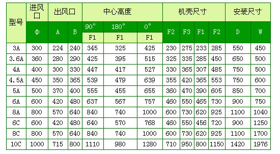 A式为叶轮和电机直联,C式二种,900转-1250转为轴座传动,1250转-1600转为轴承箱传动